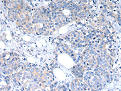 The image on the left is immunohistochemistry of paraffin-embedded Human breast cancer tissue using CSB-PA162500(RAB2A Antibody) at dilution 1/30, on the right is treated with synthetic peptide. (Original magnification: ×200)