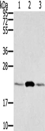 Gel: 12%SDS-PAGE, Lysate: 40 μg, Lane 1-3: RAW264.7, hepg2 cells, hela cells, Primary antibody: CSB-PA994941(RAB9A Antibody) at dilution 1/300, Secondary antibody: Goat anti rabbit IgG at 1/8000 dilution, Exposure time: 30 seconds