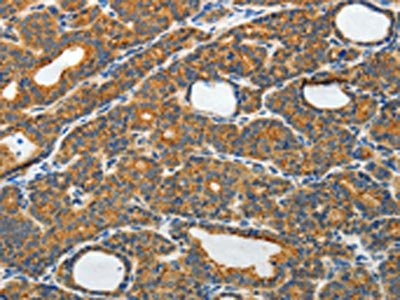 The image on the left is immunohistochemistry of paraffin-embedded Human thyroid cancer tissue using CSB-PA869855(RAMP3 Antibody) at dilution 1/40, on the right is treated with fusion protein. (Original magnification: ×200)