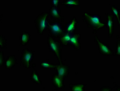 Immunofluorescence staining of U251 cells with CSB-PA803130LA01HU at 1:66, counter-stained with DAPI. The cells were fixed in 4% formaldehyde, permeabilized using 0.2% Triton X-100 and blocked in 10% normal Goat Serum. The cells were then incubated with the antibody overnight at 4°C.The secondary antibody was Alexa Fluor 488-congugated AffiniPure Goat Anti-Rabbit IgG(H+L).