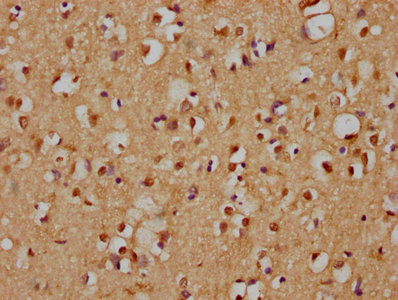 IHC image of CSB-PA803130LA01HU diluted at 1:200 and staining in paraffin-embedded human brain tissue performed on a Leica BondTM system. After dewaxing and hydration, antigen retrieval was mediated by high pressure in a citrate buffer (pH 6.0). Section was blocked with 10% normal goat serum 30min at RT. Then primary antibody (1% BSA) was incubated at 4°C overnight. The primary is detected by a biotinylated secondary antibody and visualized using an HRP conjugated SP system.