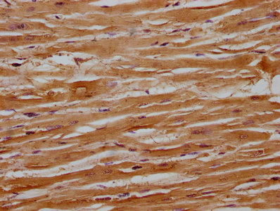 IHC image of CSB-PA853501OA01HU diluted at 1:100 and staining in paraffin-embedded human heart tissue performed on a Leica BondTM system. After dewaxing and hydration, antigen retrieval was mediated by high pressure in a citrate buffer (pH 6.0). Section was blocked with 10% normal goat serum 30min at RT. Then primary antibody (1% BSA) was incubated at 4°C overnight. The primary is detected by a biotinylated secondary antibody and visualized using an HRP conjugated SP system.