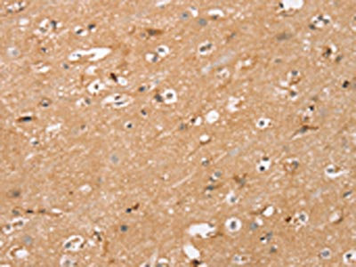 The image on the left is immunohistochemistry of paraffin-embedded Human brain tissue using CSB-PA574803(RASA3 Antibody) at dilution 1/35, on the right is treated with synthetic peptide. (Original magnification: ×200)