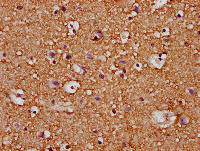 IHC image of CSB-PA890908LA01HU diluted at 1:200 and staining in paraffin-embedded human brain tissue performed on a Leica BondTM system. After dewaxing and hydration, antigen retrieval was mediated by high pressure in a citrate buffer (pH 6.0). Section was blocked with 10% normal goat serum 30min at RT. Then primary antibody (1% BSA) was incubated at 4°C overnight. The primary is detected by a biotinylated secondary antibody and visualized using an HRP conjugated SP system.