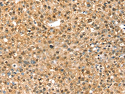 The image on the left is immunohistochemistry of paraffin-embedded Human liver cancer tissue using CSB-PA141242(RASSF9 Antibody) at dilution 1/40, on the right is treated with fusion protein. (Original magnification: ×200)