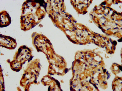 IHC image of CSB-PA019439LA01HU diluted at 1:400 and staining in paraffin-embedded human placenta tissue performed on a Leica BondTM system. After dewaxing and hydration, antigen retrieval was mediated by high pressure in a citrate buffer (pH 6.0). Section was blocked with 10% normal goat serum 30min at RT. Then primary antibody (1% BSA) was incubated at 4°C overnight. The primary is detected by a biotinylated secondary antibody and visualized using an HRP conjugated SP system.