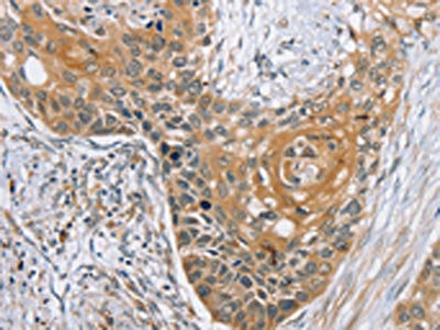 The image on the left is immunohistochemistry of paraffin-embedded Human esophagus cancer tissue using CSB-PA089355(RBM38 Antibody) at dilution 1/35, on the right is treated with synthetic peptide. (Original magnification: ×200)