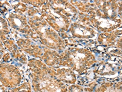 The image on the left is immunohistochemistry of paraffin-embedded Human thyroid cancer tissue using CSB-PA085970(RBM5 Antibody) at dilution 1/30, on the right is treated with fusion protein. (Original magnification: ×200)