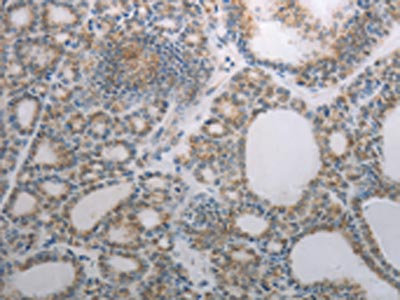 The image on the left is immunohistochemistry of paraffin-embedded Human thyroid cancer tissue using CSB-PA998451(RBMS3 Antibody) at dilution 1/70, on the right is treated with synthetic peptide. (Original magnification: ×200)