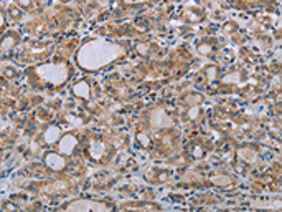 The image on the left is immunohistochemistry of paraffin-embedded Human thyroid cancer tissue using CSB-PA174726(REG3A Antibody) at dilution 1/20, on the right is treated with synthetic peptide. (Original magnification: ×200)