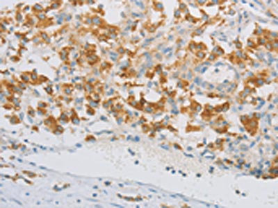 The image on the left is immunohistochemistry of paraffin-embedded Human cervical cancer tissue using CSB-PA284388(REN Antibody) at dilution 1/40, on the right is treated with fusion protein. (Original magnification: ×200)