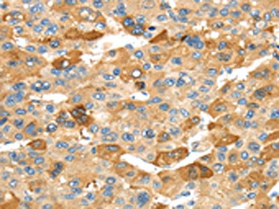 The image on the left is immunohistochemistry of paraffin-embedded Human liver cancer tissue using CSB-PA299946(RHCG Antibody) at dilution 1/30, on the right is treated with synthetic peptide. (Original magnification: ×200)