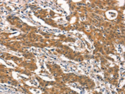 The image on the left is immunohistochemistry of paraffin-embedded Human gastric cancer tissue using CSB-PA551921(RHOBTB2 Antibody) at dilution 1/30, on the right is treated with synthetic peptide. (Original magnification: ×200)