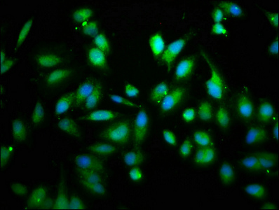 Immunofluorescence staining of Hela cells with CSB-PA019736LA01HU at 1:133, counter-stained with DAPI. The cells were fixed in 4% formaldehyde, permeabilized using 0.2% Triton X-100 and blocked in 10% normal Goat Serum. The cells were then incubated with the antibody overnight at 4°C. The secondary antibody was Alexa Fluor 488-congugated AffiniPure Goat Anti-Rabbit IgG(H+L).