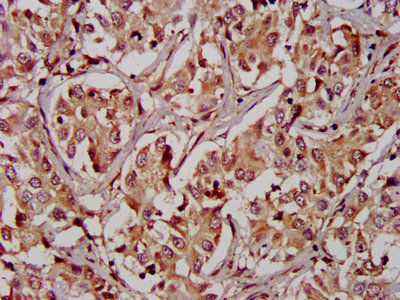 IHC image of CSB-PA019736LA01HU diluted at 1:400 and staining in paraffin-embedded human liver cancer performed on a Leica BondTM system. After dewaxing and hydration, antigen retrieval was mediated by high pressure in a citrate buffer (pH 6.0). Section was blocked with 10% normal goat serum 30min at RT. Then primary antibody (1% BSA) was incubated at 4°C overnight. The primary is detected by a biotinylated secondary antibody and visualized using an HRP conjugated SP system.