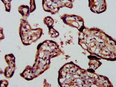 IHC image of CSB-PA019736LA01HU diluted at 1:400 and staining in paraffin-embedded human placenta tissue performed on a Leica BondTM system. After dewaxing and hydration, antigen retrieval was mediated by high pressure in a citrate buffer (pH 6.0). Section was blocked with 10% normal goat serum 30min at RT. Then primary antibody (1% BSA) was incubated at 4°C overnight. The primary is detected by a biotinylated secondary antibody and visualized using an HRP conjugated SP system.