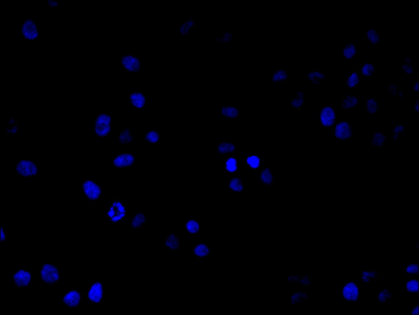 Immunofluorescence staining of Hela cell with CSB-PA019828LA01HU at 1:30, counter-stained with DAPI. The cells were fixed in 4% formaldehyde and blocked in 10% normal Goat Serum. The cells were then incubated with the antibody overnight at 4C. The secondary antibody was Alexa Fluor 488-congugated AffiniPure Goat Anti-Rabbit IgG(H+L).