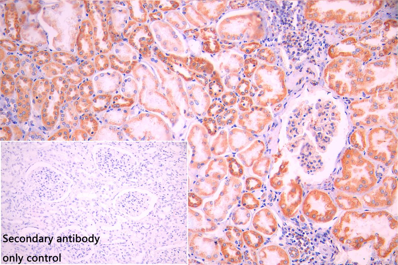 IHC image of CSB-PA811599ESR1HU diluted at 1:100 and staining in paraffin-embedded human kidney tissue performed on a Leica BondTM system. After dewaxing and hydration, antigen retrieval was mediated by high pressure in a citrate buffer (pH 6.0). Section was blocked with 10% normal goat serum 30min at RT. Then primary antibody (1% BSA) was incubated at 4°C overnight. The primary is detected by a Goat anti-rabbit polymer IgG labeled by HRP and visualized using 0.05% DAB. Secondary antibody only control: uses 1% BSA instead of primary antibody