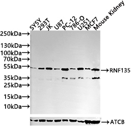 Positive WB detected in: SY5Y whole cell lysate(30μg), 293T whole cell lysate(30μg), JK whole cell lysate(30μg), U87 whole cell lysate(30μg), PC-12 whole cell lysate(30μg), 786-O whole cell lysate(30μg),U251 whole cell lysate(30μg),MCF7 whole cell lysate(30μg),Mouse Kidney tissue lysate(30μg)