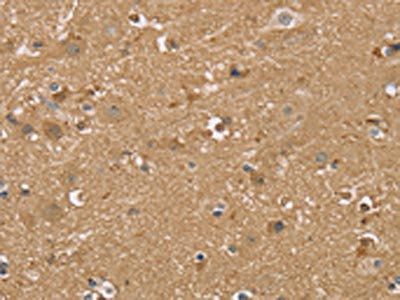 The image on the left is immunohistochemistry of paraffin-embedded Human brain tissue using CSB-PA788709(RNF139 Antibody) at dilution 1/35, on the right is treated with synthetic peptide. (Original magnification: ×200)
