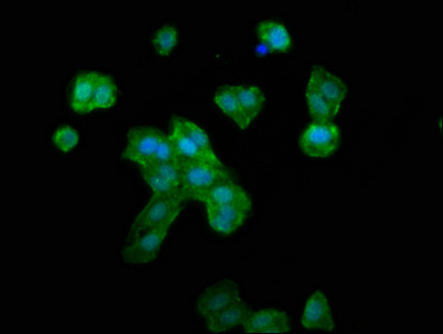 Immunofluorescence staining of HepG2 cells with CSB-PA019888LA01HU at 1:133, counter-stained with DAPI. The cells were fixed in 4% formaldehyde, permeabilized using 0.2% Triton X-100 and blocked in 10% normal Goat Serum. The cells were then incubated with the antibody overnight at 4°C. The secondary antibody was Alexa Fluor 488-congugated AffiniPure Goat Anti-Rabbit IgG(H+L).