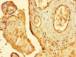 Immunohistochemistry of paraffin-embedded human placenta tissue using CSB-PA019889LA01HU at dilution of 1:100