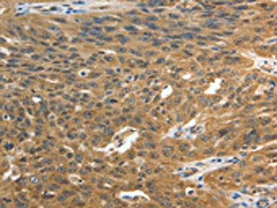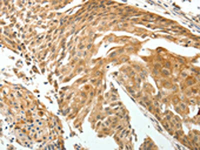 The image on the left is immunohistochemistry of paraffin-embedded Human cervical cancer tissue using CSB-PA242246(ROCK2 Antibody) at dilution 1/15, on the right is treated with fusion protein. (Original magnification: ×200)