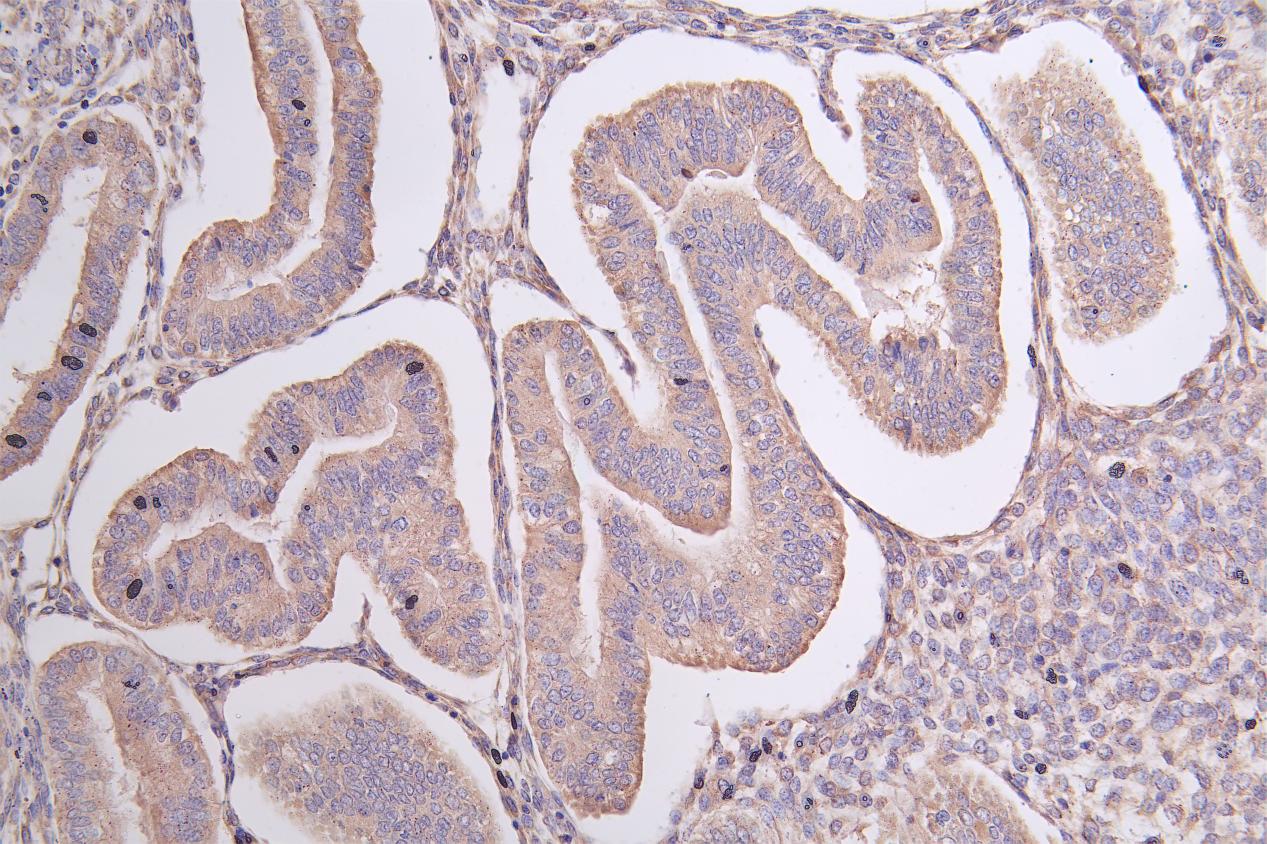 IHC image of CSB-PA020160LA01HU diluted at 1:50 and staining in paraffin-embedded human endometrial cancer performed on a Leica BondTM system. After dewaxing and hydration, antigen retrieval was mediated by high pressure in a citrate buffer (pH 6.0). Section was blocked with 10% normal goat serum 30min at RT. Then primary antibody (1% BSA) was incubated at 4°C overnight. The primary is detected by a Goat anti-rabbit polymer IgG labeled by HRP and visualized using 0.05% DAB.