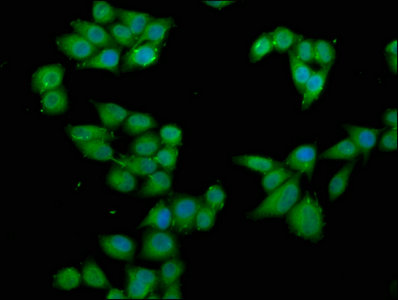 Immunofluorescence staining of Hela cells with CSB-PA618003LA01HU at 1:66, counter-stained with DAPI. The cells were fixed in 4% formaldehyde, permeabilized using 0.2% Triton X-100 and blocked in 10% normal Goat Serum. The cells were then incubated with the antibody overnight at 4°C. The secondary antibody was Alexa Fluor 488-congugated AffiniPure Goat Anti-Rabbit IgG(H+L).