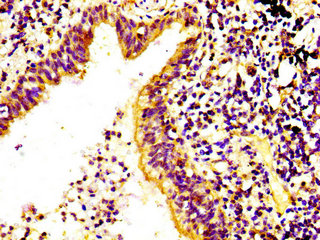 IHC image of CSB-PA891943LA01HU diluted at 1:400 and staining in paraffin-embedded human lung cancer performed on a Leica BondTM system. After dewaxing and hydration, antigen retrieval was mediated by high pressure in a citrate buffer (pH 6.0). Section was blocked with 10% normal goat serum 30min at RT. Then primary antibody (1% BSA) was incubated at 4°C overnight. The primary is detected by a biotinylated secondary antibody and visualized using an HRP conjugated SP system.