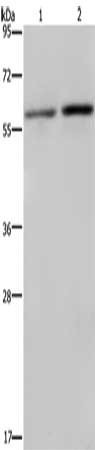 Gel: 8%SDS-PAGE, Lysate: 40 μg, Lane 1-2: Hela cells, K562 cells, Primary antibody: CSB-PA182949(RPS6KB2 Antibody) at dilution 1/250, Secondary antibody: Goat anti rabbit IgG at 1/8000 dilution, Exposure time: 10 minutes