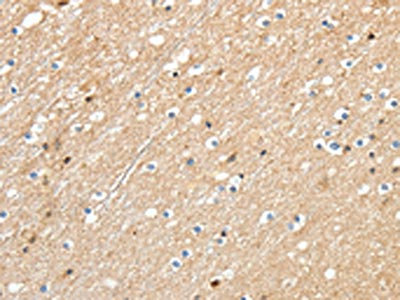 The image on the left is immunohistochemistry of paraffin-embedded Human brain tissue using CSB-PA248209(RRAD Antibody) at dilution 1/30, on the right is treated with synthetic peptide. (Original magnification: ×200)