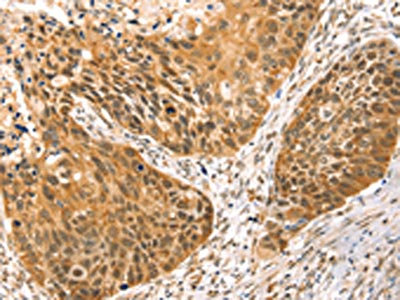 The image on the left is immunohistochemistry of paraffin-embedded Human esophagus cancer tissue using CSB-PA931417(RRAGC Antibody) at dilution 1/20, on the right is treated with fusion protein. (Original magnification: ×200)