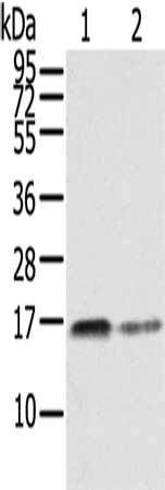 Gel: 6%SDS-PAGE, Lysate: 40 μg, Lane 1-2: PC3 cells, A549 cells, Primary antibody: CSB-PA444135(RRAS Antibody) at dilution 1/350, Secondary antibody: Goat anti rabbit IgG at 1/8000 dilution, Exposure time: 30 seconds