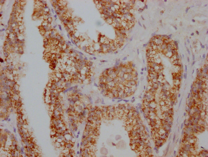IHC image of CSB-PA020626HA01HU diluted at 1:100 and staining in paraffin-embedded human prostate cancer performed on a Leica BondTM system. After dewaxing and hydration, antigen retrieval was mediated by high pressure in a citrate buffer (pH 6.0). Section was blocked with 10% normal goat serum 30min at RT. Then primary antibody (1% BSA) was incubated at 4°C overnight. The primary is detected by a Goat anti-rabbit IgG labeled by HRP and visualized using 0.05% DAB.