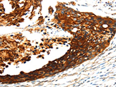 The image on the left is immunohistochemistry of paraffin-embedded Human esophagus cancer tissue using CSB-PA163063(S100A14 Antibody) at dilution 1/30, on the right is treated with fusion protein. (Original magnification: ×200)