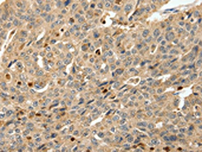 The image on the left is immunohistochemistry of paraffin-embedded Human ovarian cancer tissue using CSB-PA443727(S100A4 Antibody) at dilution 1/80, on the right is treated with synthetic peptide. (Original magnification: ×200)