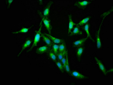 Immunofluorescence staining of Hela cells with CSB-PA020642LA01HU at 1:133, counter-stained with DAPI. The cells were fixed in 4% formaldehyde, permeabilized using 0.2% Triton X-100 and blocked in 10% normal Goat Serum. The cells were then incubated with the antibody overnight at 4°C. The secondary antibody was Alexa Fluor 488-congugated AffiniPure Goat Anti-Rabbit IgG(H+L).