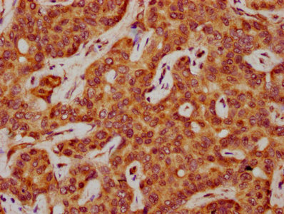 IHC image of CSB-PA020657LA01HU diluted at 1:600 and staining in paraffin-embedded human liver cancer performed on a Leica BondTM system. After dewaxing and hydration, antigen retrieval was mediated by high pressure in a citrate buffer (pH 6.0). Section was blocked with 10% normal goat serum 30min at RT. Then primary antibody (1% BSA) was incubated at 4°C overnight. The primary is detected by a biotinylated secondary antibody and visualized using an HRP conjugated SP system.