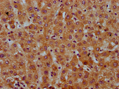IHC image of CSB-PA020657LA01HU diluted at 1:600 and staining in paraffin-embedded human liver tissue performed on a Leica BondTM system. After dewaxing and hydration, antigen retrieval was mediated by high pressure in a citrate buffer (pH 6.0). Section was blocked with 10% normal goat serum 30min at RT. Then primary antibody (1% BSA) was incubated at 4°C overnight. The primary is detected by a biotinylated secondary antibody and visualized using an HRP conjugated SP system.