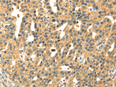 The image on the left is immunohistochemistry of paraffin-embedded Human breast cancer tissue using CSB-PA152384(SAMD7 Antibody) at dilution 1/35, on the right is treated with fusion protein. (Original magnification: ×200)