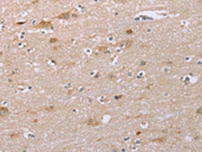 The image on the left is immunohistochemistry of paraffin-embedded Human brain tissue using CSB-PA095524(SAMD9L Antibody) at dilution 1/30, on the right is treated with synthetic peptide. (Original magnification: ×200)