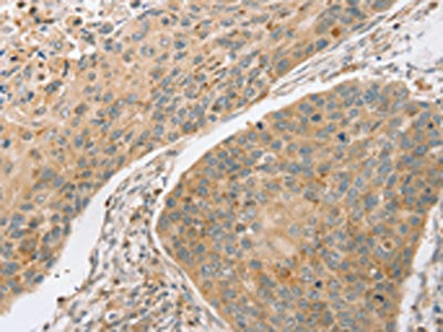 The image on the left is immunohistochemistry of paraffin-embedded Human esophagus cancer tissue using CSB-PA180985(SCAP Antibody) at dilution 1/20, on the right is treated with fusion protein. (Original magnification: ×200)