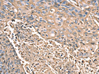 The image on the left is immunohistochemistry of paraffin-embedded Human esophagus cancer tissue using CSB-PA147244(SCN1B Antibody) at dilution 1/35, on the right is treated with synthetic peptide. (Original magnification: ×200)