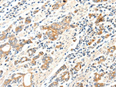 The image on the left is immunohistochemistry of paraffin-embedded Human gastric cancer tissue using CSB-PA937791(SCN2A Antibody) at dilution 1/25, on the right is treated with synthetic peptide. (Original magnification: ×200)