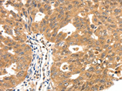 The image on the left is immunohistochemistry of paraffin-embedded Human ovarian cancer tissue using CSB-PA988378(SCN5A Antibody) at dilution 1/30, on the right is treated with synthetic peptide. (Original magnification: ×200)