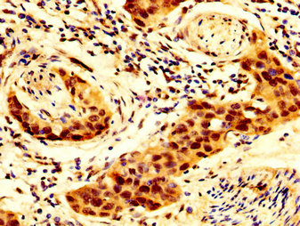 IHC image of CSB-PA020849LA01HU diluted at 1:300 and staining in paraffin-embedded human bladder cancer performed on a Leica BondTM system. After dewaxing and hydration, antigen retrieval was mediated by high pressure in a citrate buffer (pH 6.0). Section was blocked with 10% normal goat serum 30min at RT. Then primary antibody (1% BSA) was incubated at 4°C overnight. The primary is detected by a biotinylated secondary antibody and visualized using an HRP conjugated SP system.