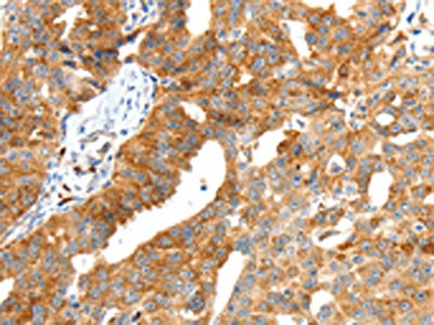 The image on the left is immunohistochemistry of paraffin-embedded Human thyroid cancer tissue using CSB-PA797544(SCT Antibody) at dilution 1/40, on the right is treated with synthetic peptide. (Original magnification: ×200)