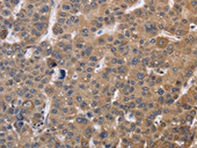 The image on the left is immunohistochemistry of paraffin-embedded Human liver cancer tissue using CSB-PA037904(SDCCAG3 Antibody) at dilution 1/30, on the right is treated with fusion protein. (Original magnification: ×200)