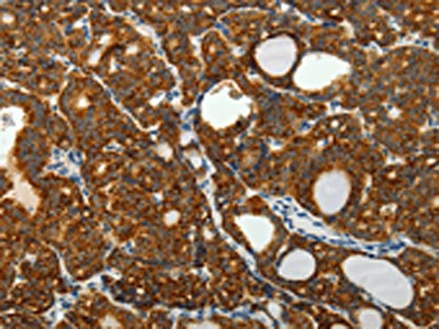 The image on the left is immunohistochemistry of paraffin-embedded Human thyroid cancer tissue using CSB-PA292716(SELM Antibody) at dilution 1/50, on the right is treated with fusion protein. (Original magnification: ×200)